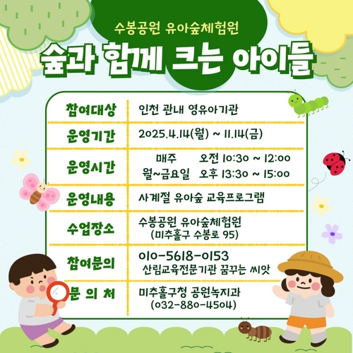 인천 미추홀구(구청장 이영훈)는 관내 수봉공원에서 유아들이 자연을 체험할 수 있는 '유아 숲 체험 프로그램'을 운영 중이라고 5일 밝혔다.