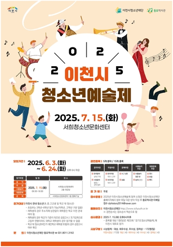 이천시(시장 김경희)는 지역 청소년의 예술 재능과 실력을 펼칠 2025년 청소년종합예술제를 오는 7월 15일(화)에 서희청소년문화센터 대강당에서 개최한다고 밝혔다.