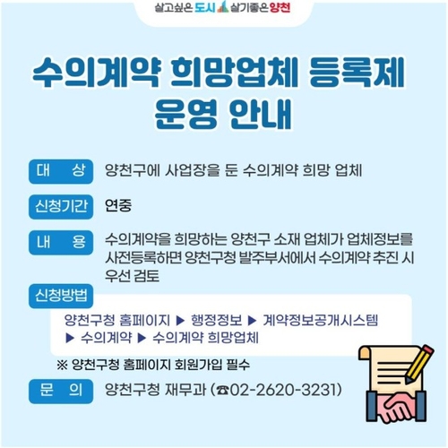 등록은 연중 상시 가능하며 관련 정보는 양천구청 홈페이지 '계약정보공개시스템' 내 '수의계약 희망업체' 페이지에서 확인할 수 있다.